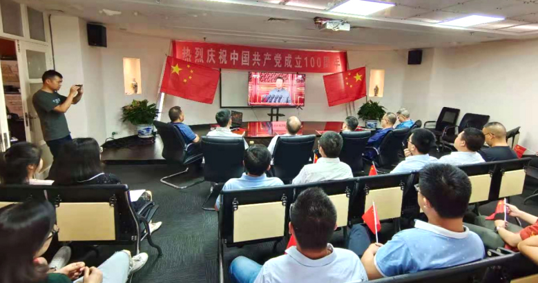 公司全体员工在公司会议室集中收看电视直播,共庆中国共产党百年华诞。